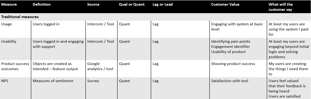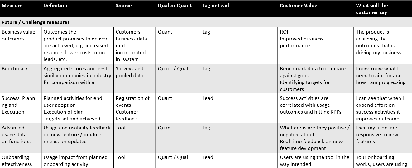 The output was a view of mapped current and future-focused CS measures, and why you’d use them. Here is the groups output after I took the raw material, cleaned it up, tweaked it and added a little of my own spin.