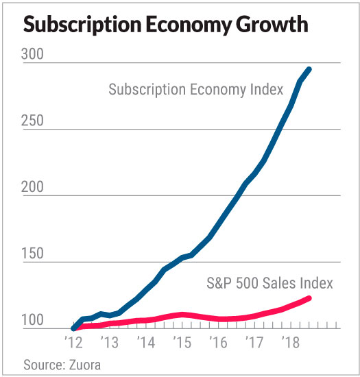 Here is a good summary of the trend which includes commentary on all the different industries being effected by the subscription economy: Subscription Services Draw Companies Closer To Customers. As with so many of the posts that I reference to the subscription economy, this one points to its darling Zuora, as you can see from the source of the chart. But their standing at the top of the subscription economy heap (as a company that powers the economy) may be under threat as new entrants join the fray: Stripe billing launches in Europe to power subscription companies across the continent.