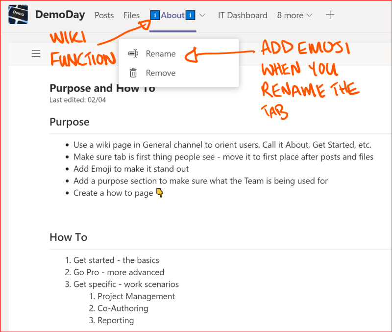 If you want a Team or even a Channel to stand out and work effectively, you can us Emoji again but more importantly, the wiki function and a page to orient users. When users land in the Team or Channel, this will grab their attention.