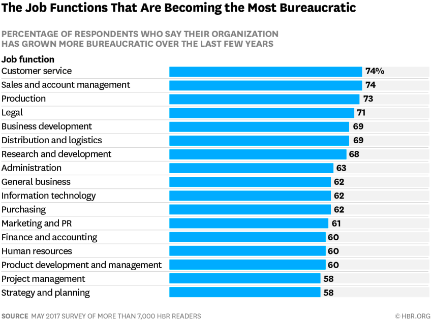 Bureaucracy is not new and growing. And some of the worst effected areas of a business are in customer service. Take a look at this research published not too long ago in an HBR article: What We Learned About Bureaucracy from 7,000 HBR Readers. I’ve used it twice before in posts to make the argument for less of this pernicious habit and in the context of customer success as well as touchpoints: