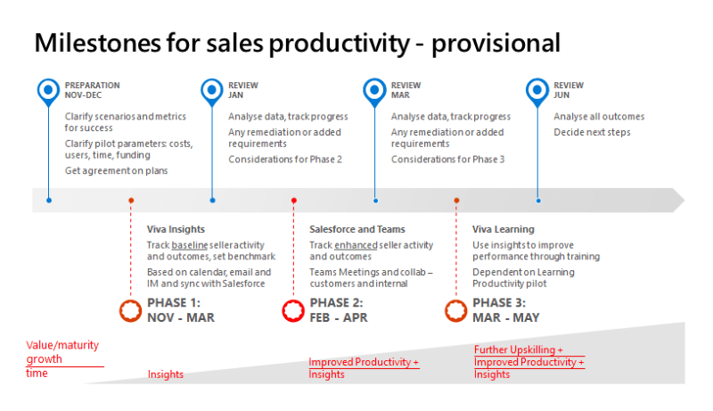 Start with setting up Viva Insights in order to track seller activity and set benchmarks for outcomes/performance and understanding learning/performance gaps. Viva Insights will also be used to track productivity gains throughout. Plan first intervention to drive productivity improvements. Start with the existing App for Salesforce in Teams but look to extend the functionality with Teams Meetings extensions. Users can already add connected records inline within their Teams conversations. Users can also add records in Teams Channels as a Tab to have as a permanent reference point for account teams. Extending access to Salesforce for Teams Meetings will drive further sales effectiveness by having account data on hand and visible while on customer calls as well as the ability to update records. Using Teams Phone System / Voice which customer have purchased with its standard features (voicemail, call forwarding, speed dial, contact management, etc.) should also be considered. Once baseline effectiveness and benchmarks set and intervention impact measured, Viva Learning (possibly in combination with Viva Topics) can be used to manage gaps.