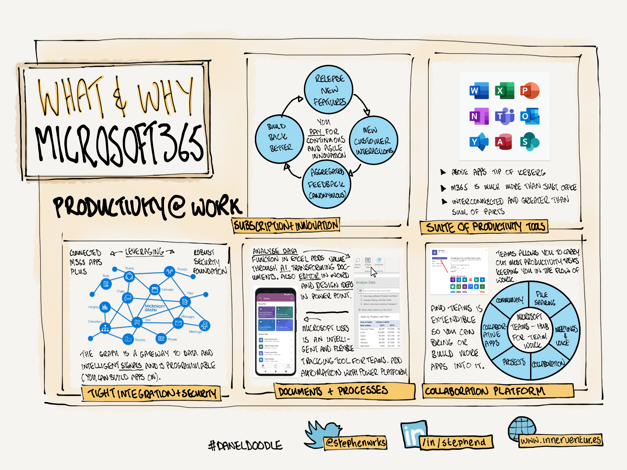 I’ve started my thinking on how to address this with a DanelDoodle, always a good way for me to narrow my thinking and generally sense make. As you can imagine, 10 minutes in which to explain M365, a platform so vast in capability, is not an easy task. Maybe impossible. But it is a good exercise. And on this point, this is just an exercise. This is not a definitive answer and will likely change as I prepare for my session and use this to gather feedback. Some explainers below the doodle.