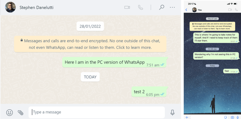 I tried ages ago to find out if I could have a conversation with myself on WhatsApp. Turns out you can but it’s a right royal pain to activate. Also, its not persistent between devices, i.e. when I message myself on the phone, I expect to see that same message on my desktop App. That doesn’t work. See below how with the same profile, different messages between PC and iPhone based messages are shown.