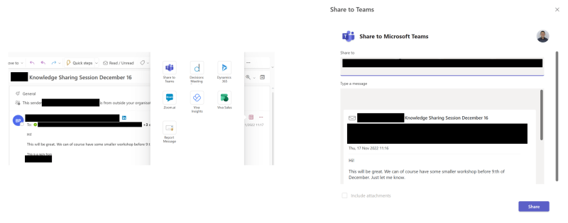 From the screenshots above (where I have redacted some details) you can see the view on the left is from an email where you can access the Share to Teams Add In (this view is from Outlook Web App – it might be slightly different in the Outlook client). On the right is what pops up so you can select who to share it to. It automatically suggests recipients of the email but then if you go into the Share To field, you get suggestions from recent Teams chats or you can search and find the right chat (group or individual).