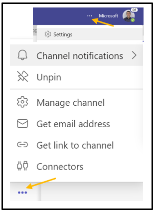 For starters, you should manage notifications globally from Teams Settings. In the top right of the screenshot you can see where to access those – clue, it’s the three dots next to your profile pic.