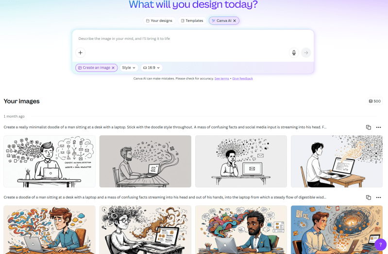 I used the AI design creation options in both cases although this is not the only option. You can create images using a vast library of stock images in Canva’s case.