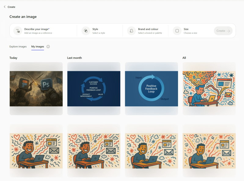 Create in the M365 App was much slower to produce one image (the one with logo’s) whereas Canva produced several options, faster. Of course, I could request alternatives from Create but it’s always nice to have options immediately.