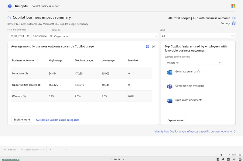 With this tool, you can upload your business performance data and map it to adoption data. Above is an example screenshot from the tool showing business outcome results based on different levels of adoption.